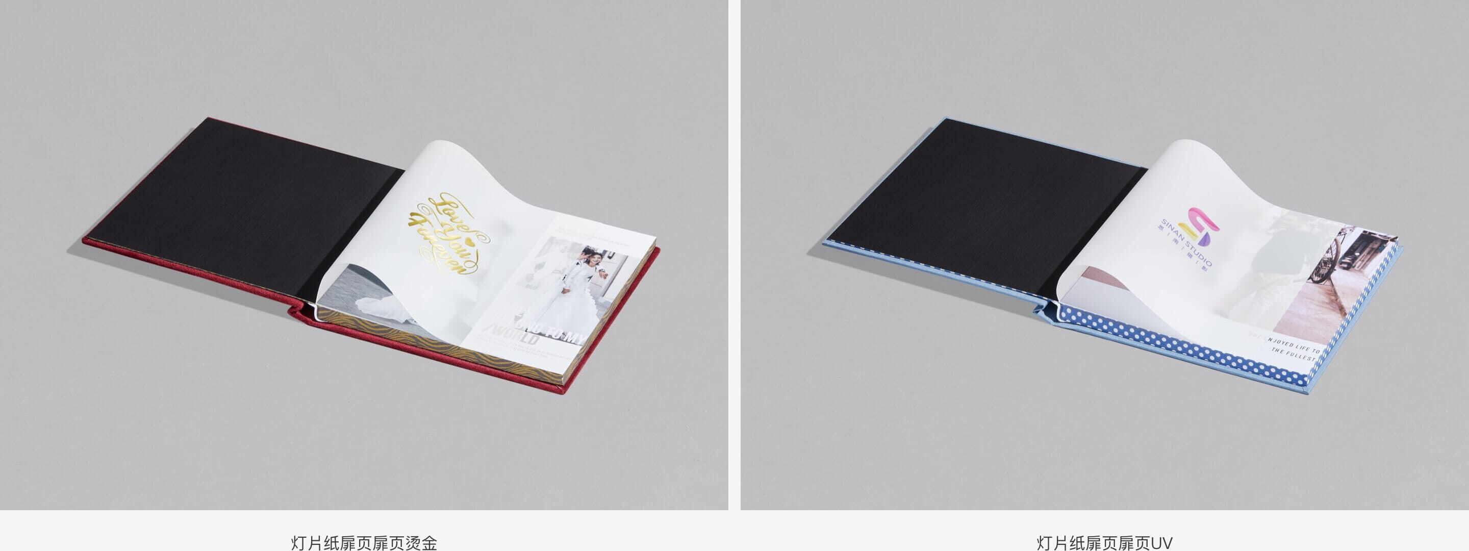 棉纸部位支持烫金及压印与UV打印工艺,灯片纸部位支持无版烫金与UV打印工艺,经典工艺打造经典相册